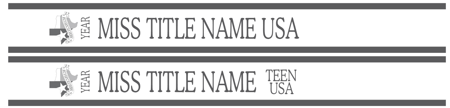 Sashes are silver and white, have a custom stitched title and Miss Texas USA logo, and resemble the attached image in appearance and font. They have a lead time of approximately four (4) weeks upon receipt of order.